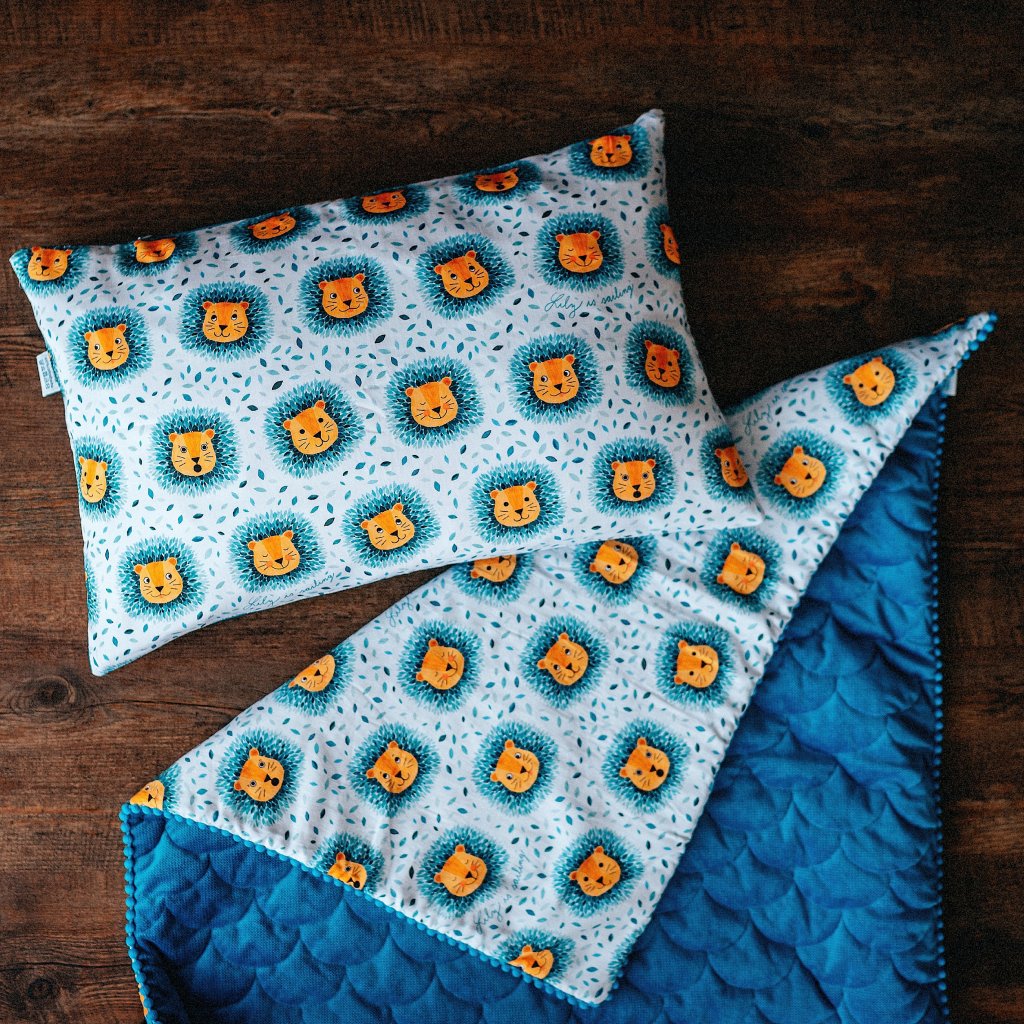 Z jedné strany je prošívaný tyrkysový velvet a z druhé krásný autorský potisk na bavlněném saténu,který pro vás nakreslila Tereza Cimburková.